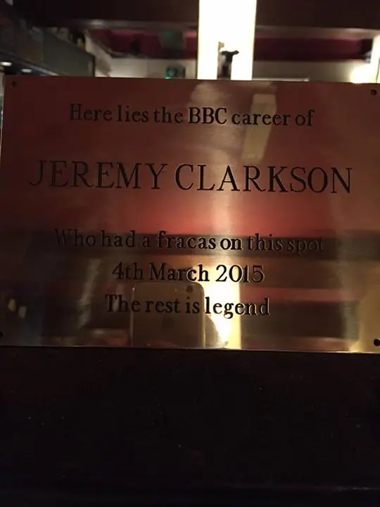 The plaque reads: “Here lies the BBC career of JEREMY CLARKSON, who had a fracas on this spot, 4th March 2015. The rest is legend”.